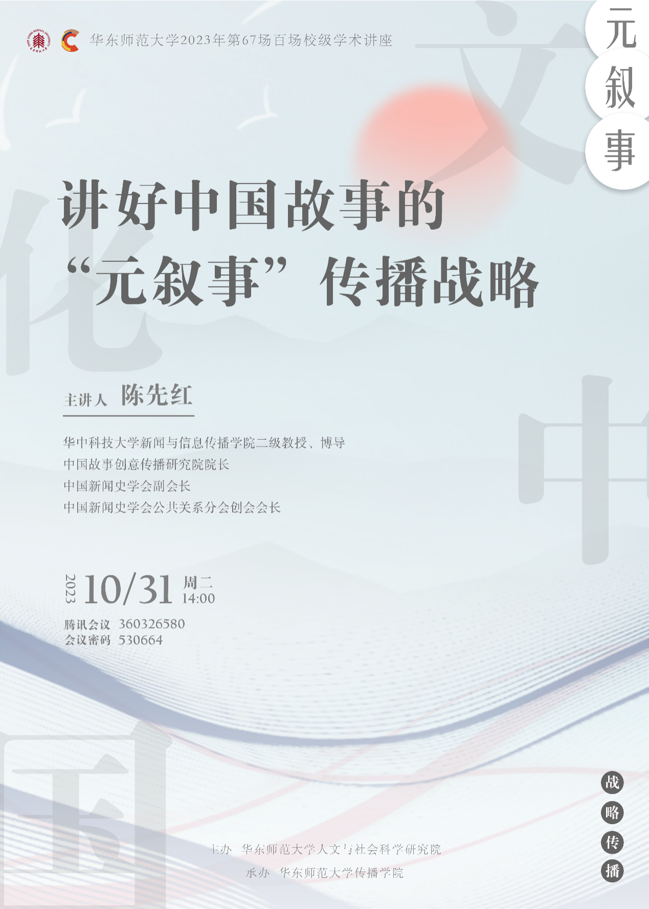 讲好中国故事的实质是为了应对美西方发起的新冷战而提出的“巧传播战略”。本讲座选择“家庭价值观、春节、汉字、《西游记》、儒释道”五个元故事题材,作为一组具有示范性和实验性研究样本,围绕文化理念、文化仪式、文化符号、文化产品、文化信仰五个维度构建文化中国的IP故事世界,提出讲好中国故事的五元叙事传播战略,即家庭价值观金字塔叙事战略、春节文化仪式叙事战略、汉字多模态跨媒介叙事战略、西游记文旅融合走出去战略和儒释道思想国际传播战略。