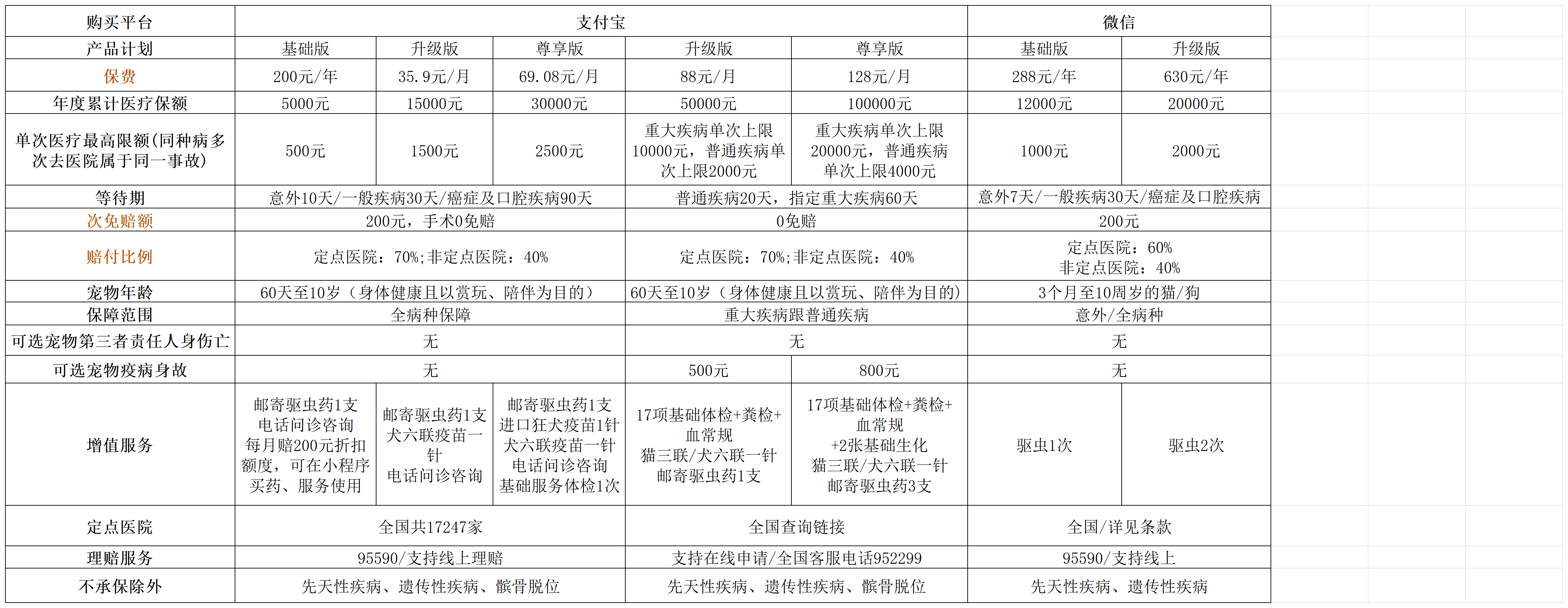 各类宠物医保套餐