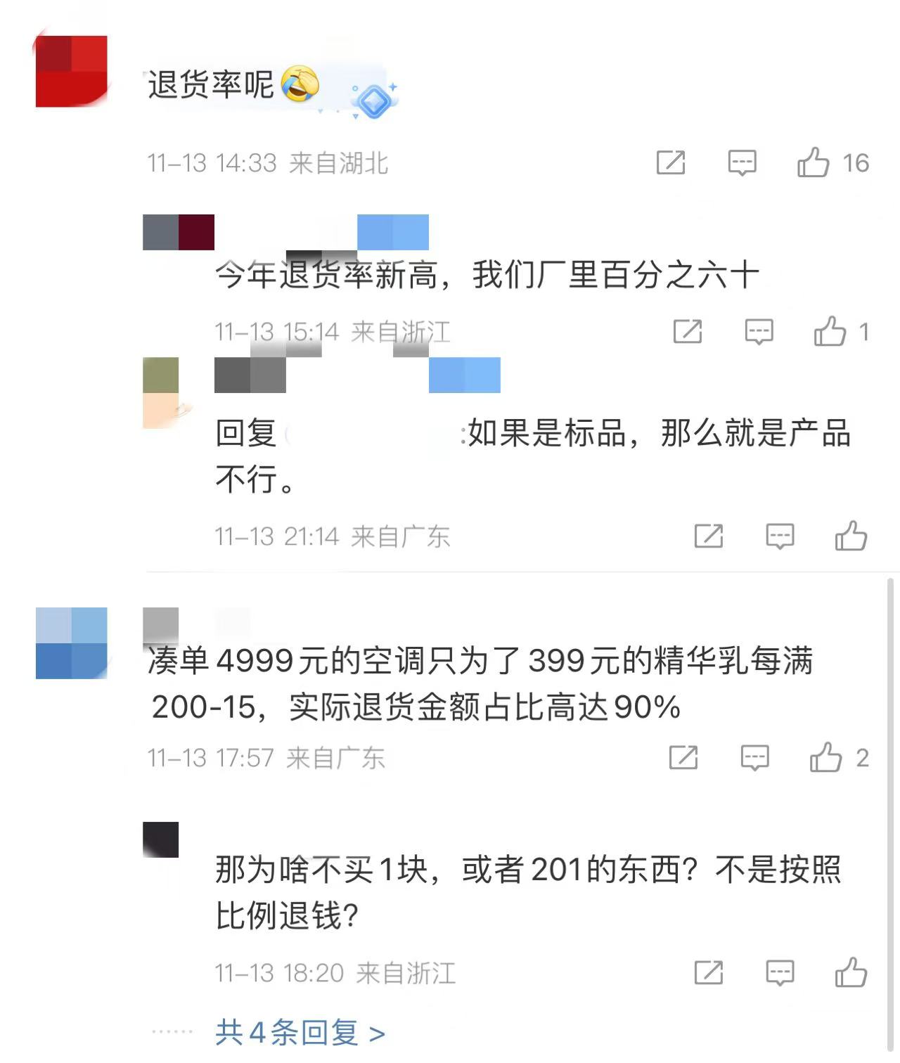 不少网友认为2024年双十一的巨额成交数据只是一种“虚假繁荣”。一是双十一的时长拉长,仅天猫平台就把活动战线从2023年的18天增加到29天,交易额随着更长的统计时间而增加似乎再正常不过。二是基于盛行的“凑单退货”现象,网友提出了“退货商品是否算入销售额”的疑问。