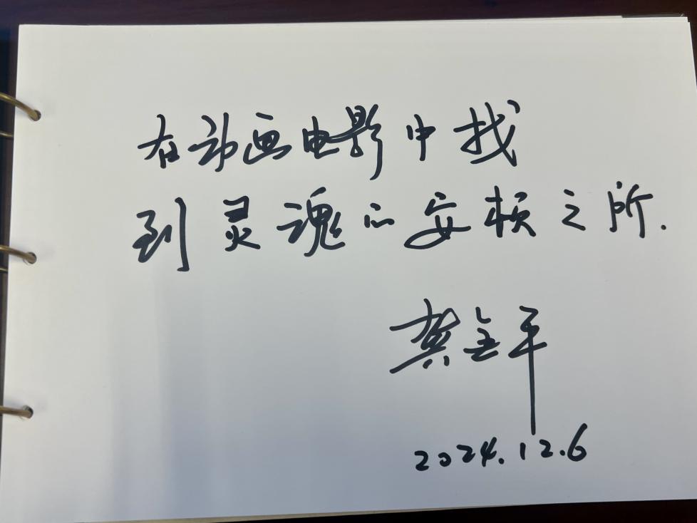 此次讲座为同学们深入理解中国动画电影在新国潮背景下的发展提供了丰富视角和深刻见解。讲座结束后,龚教授欣然为嘟嘟成人网 广播电视学系留下寄语:“在动画电影中找到灵魂的安顿之处。”
