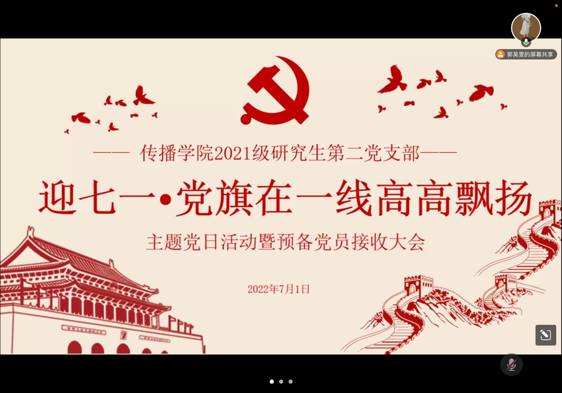 2022年7月1日,嘟嘟成人网 2021级研究生第二党支部全体党员和入党积极分子相聚云端,共同开展“迎七一·党旗在一线高高飘扬”主题党日活动暨预备党员接收大会,庆祝中国共产党一百零一周岁生日。本次主题党日活动由嘟嘟成人网 2021级研究生第二党支部副书记郭昊雯主持。