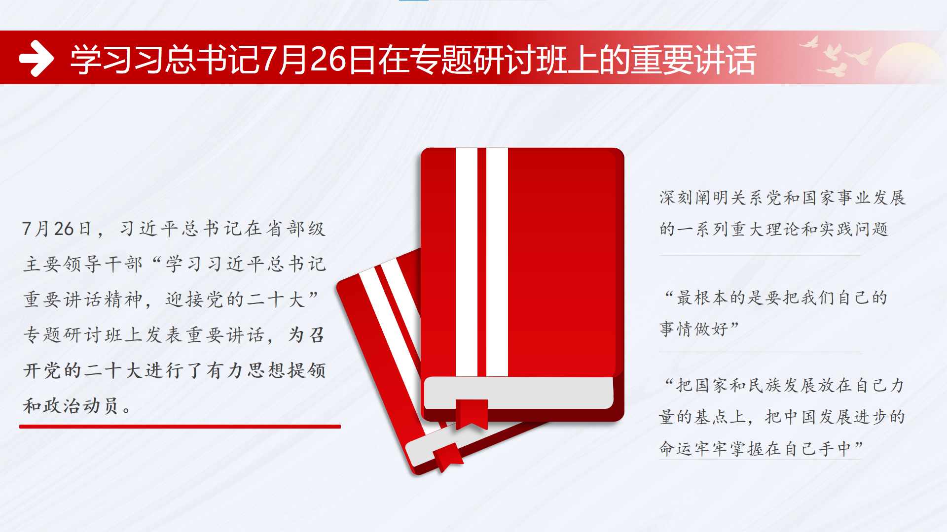 会议第一项,由陈奕如同志带领支部党员学习贯彻习近平总书记7月26日在专题研讨班上的重要讲话。在讲话中,习近平总书记以宏大的战略视野、精准的形势研判、前瞻的科学谋划和清晰的思路呈现,深刻阐明关系党和国家事业发展的一系列重大理论和实践问题,为召开党的二十大进行了有力思想提领和政治动员。他强调,“把国家和民族发展放在自己力量的基点上,把中国发展进步的命运牢牢掌握在自己手中”,鼓舞和动员支部党员将持续提高政治站位,强化政治自觉,在党中央坚强领导下,踔厉奋发、勇毅前行、团结奋斗,奋力谱写全面建设社会主义现代化国家崭新篇章。