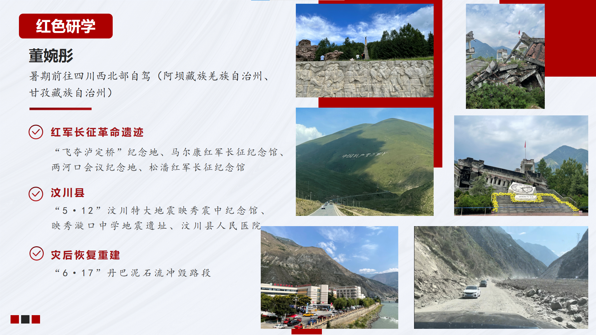 董婉彤同志与大家分享了她在川西的所见所感。她探寻“飞夺泸定桥”纪念地、马尔康红军长征纪念馆等革命遗迹,体悟伟大长征精神;参观汶川大地震遗址,缅怀遇难同胞和救灾英烈;途径丹巴泥石流冲毁路段,感受灾后重建的中国速度。她直言,沿着红军长征的革命之路,即使以车代步仍然困难重重,更加深刻感受先辈们不畏艰险的英勇精神与气魄。