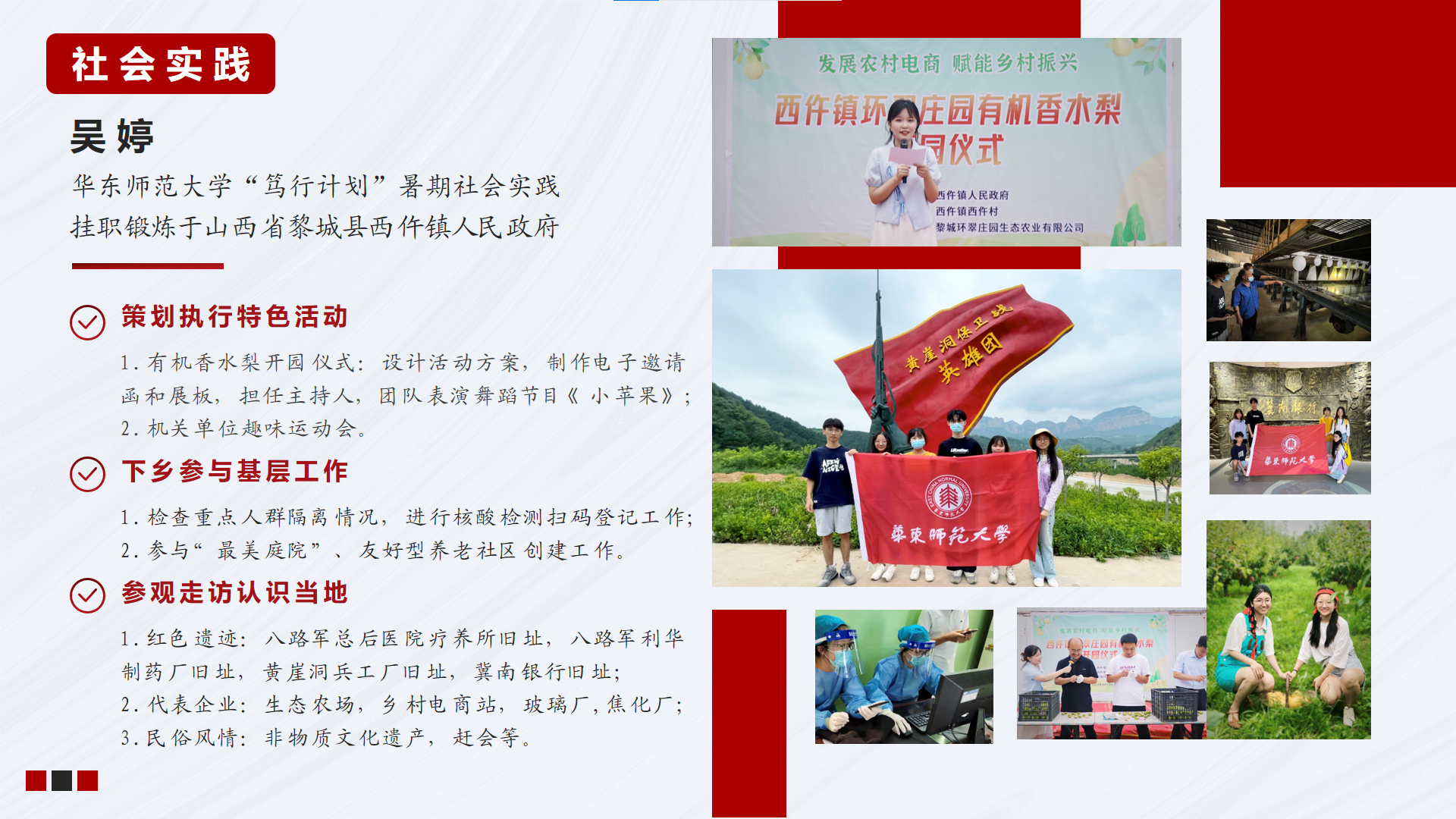 吴婷同志则参与了嘟嘟成人网 “阡陌笃行计划”暑期社会实践活动,前往山西省黎城县西仵镇人民政府进行三周挂职锻炼。她带领实践团队为当地特色农产品策划与执行开园仪式,以精彩纷呈的活动现场助力乡村振兴。此外,下乡服务基层,日常核酸检测,走访红色遗迹与代表企业亦是其丰富的工作内容。