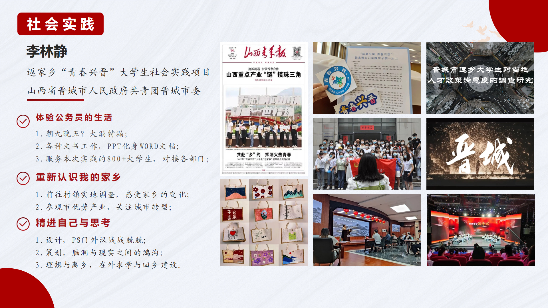 除挂职锻炼外,另有王寒冰、李睿两位同志分别前往河南省周王村、内蒙古自治区克什克腾旗对当地群体生活状况进行实地调研,感受国家政策和党员干部对当地发展的重要性。