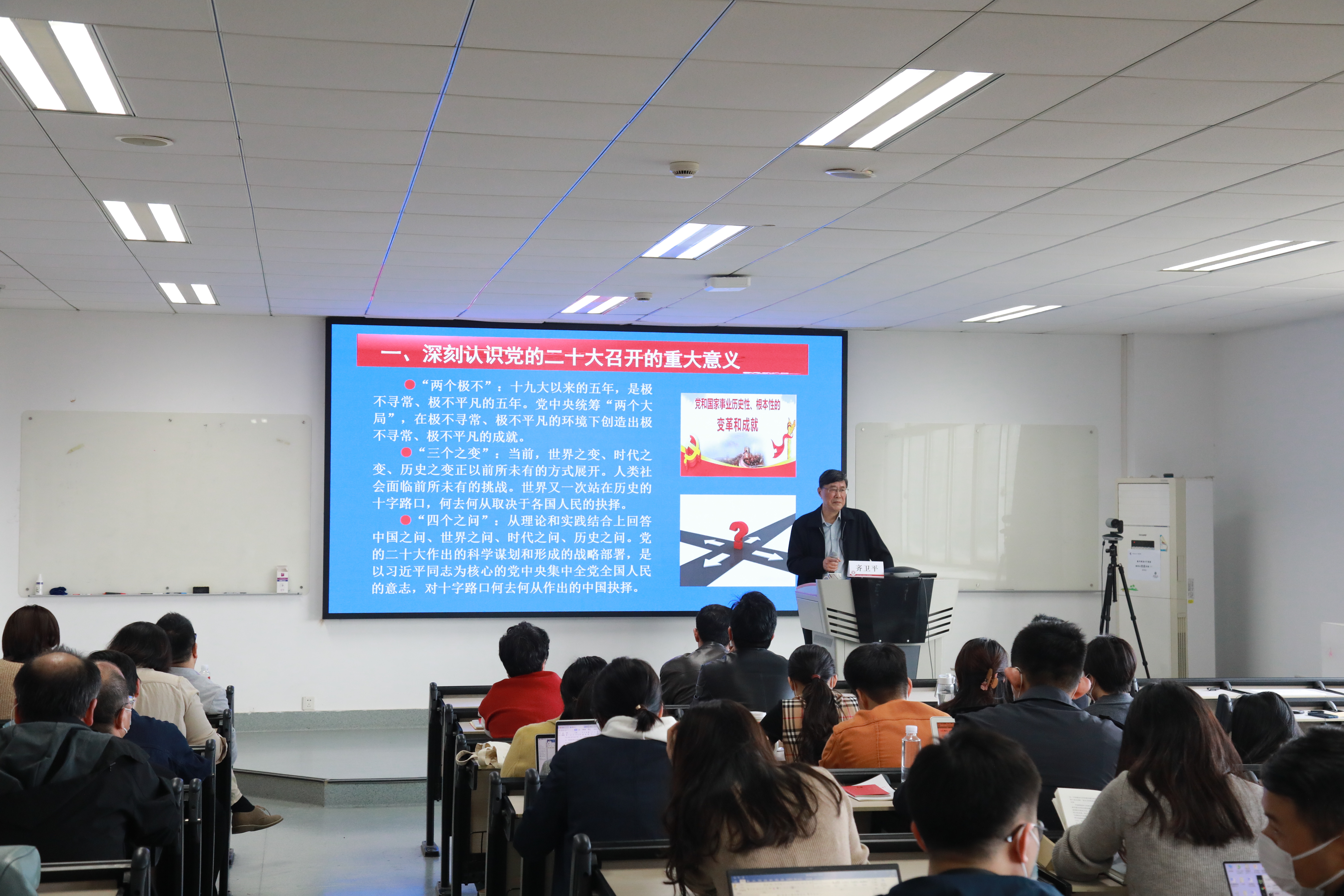 齐卫平教授以“奋斗新时代新征程的思想指南和行动纲领——认真学习领会党的二十大精神”为题,从“深刻认识党的二十大召开的重大意义”、“深刻理解党的二十大主题”、“认真学习党的二十大报告的主要内容”、“奋力谱写更加绚丽的华章”四个部分,对党的二十大报告进行了全面深入的辅导阐释。