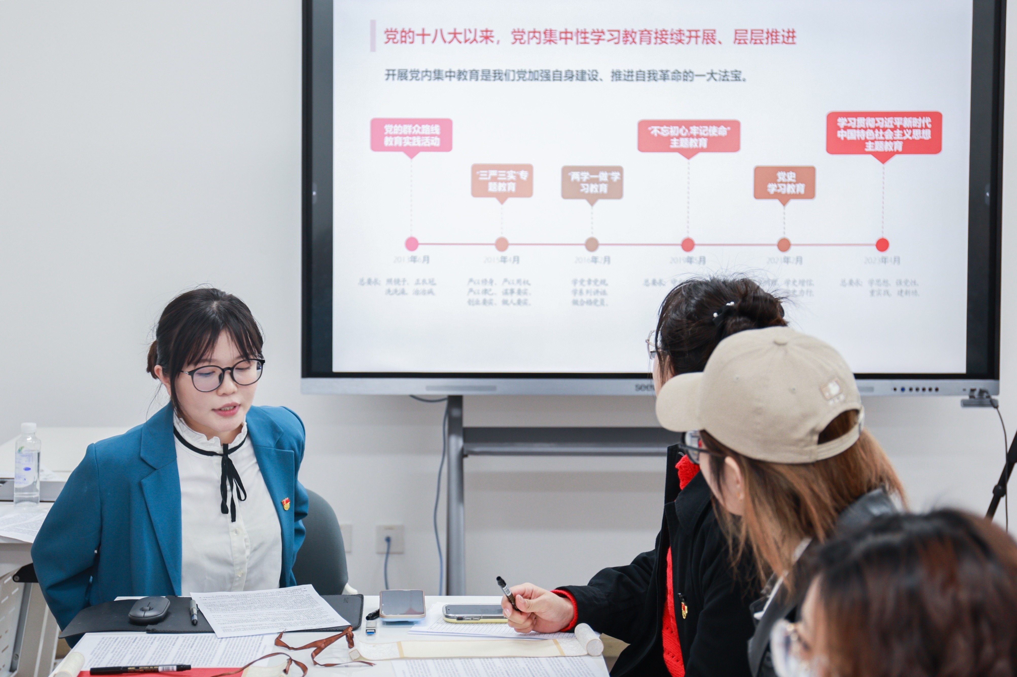 活动第一项,由嘟嘟成人网 2021级硕士研究生第一党支部书记吴婷领学此次主题教育相关的会议、重要讲话精神。她首先回顾了党的十八大以来已在全党开展的5次党内集中性学习教育,指出“开展党内集中教育是我们党加强自身建设、推进自我革命的一大法宝”。紧接着,吴婷带领与会成员依次学习中共中央政治局会议精神、习近平总书记在中共中央政治局第四次集体学习时的重要讲话精神和在学习贯彻习近平新时代中国特色社会主义思想主题教育工作会议上的重要讲话精神。