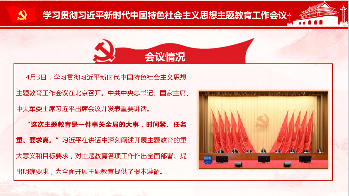 会议伊始,郭昊雯对此次主题教育工作会议情况进行了回顾,通过梳理主题教育的总要求、根本任务、工作部署、具体要求等内容,向党员们传达了主题教育会议精神,并强调在之后的学习活动中,党员们要不断提高政治判断力、政治领悟力、政治执行力,增强“四个意识”、坚定“四个自信”、做到“两个维护”。