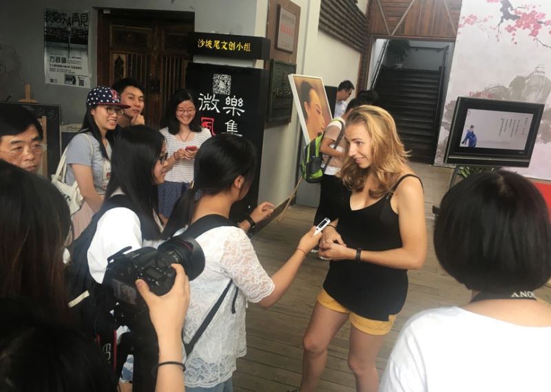 同学们在采访法国交流生戏迷