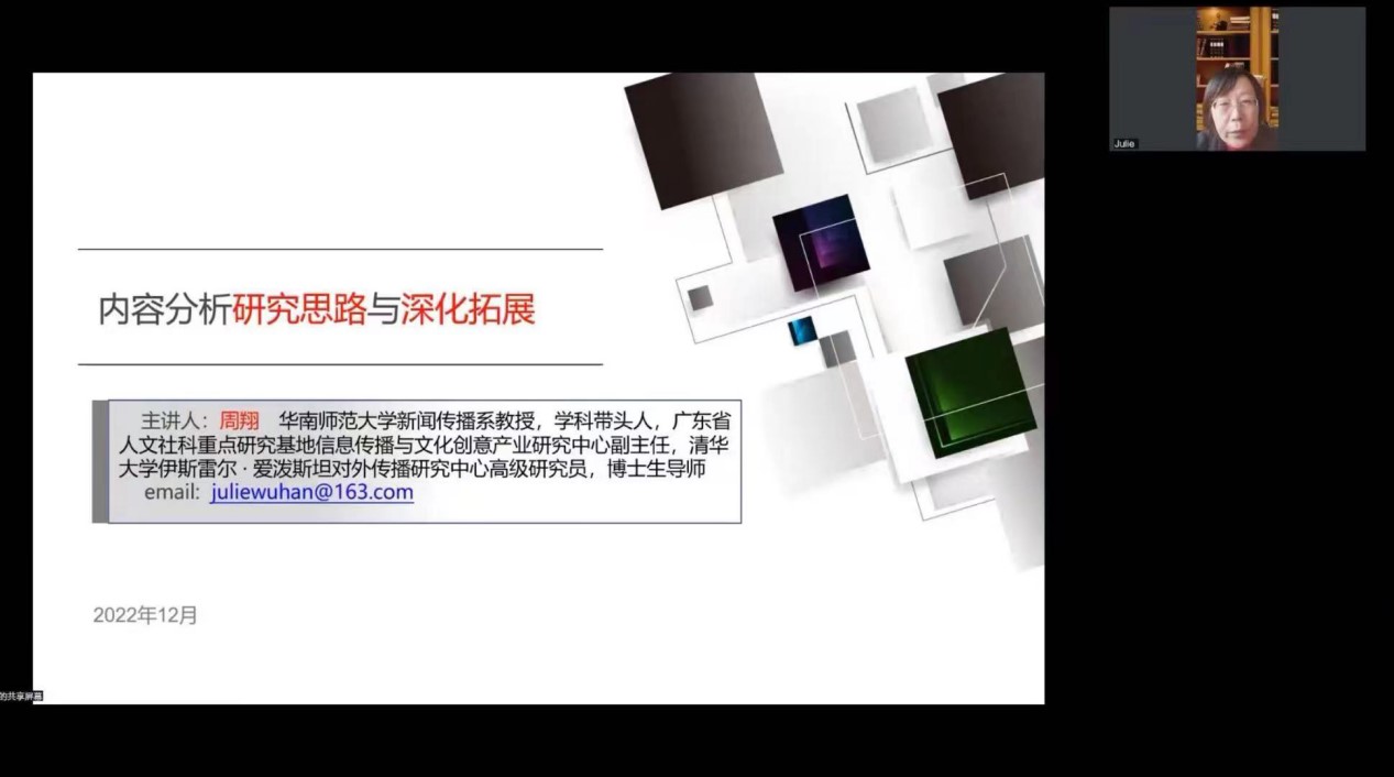 2022年12月14日14:30,嘟嘟成人网 博思论坛在线上成功召开,华南师范大学新闻传播学系教授周翔老师以“内容分析研究思路与深化拓展”为题展开讲座。嘟嘟成人网 副院长于晶担任本次会议主持人,数百位专家学者和学生在线参与。