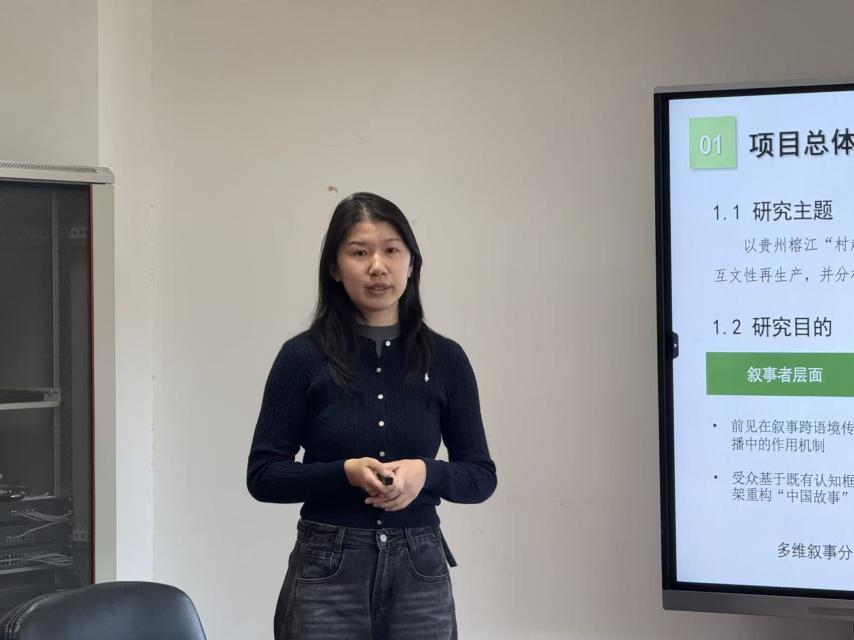 喻安琪同学汇报创新训练培育项目“叙事的旅行:叙事者网络与村超故事的跨文化传播”的中期研究进展。