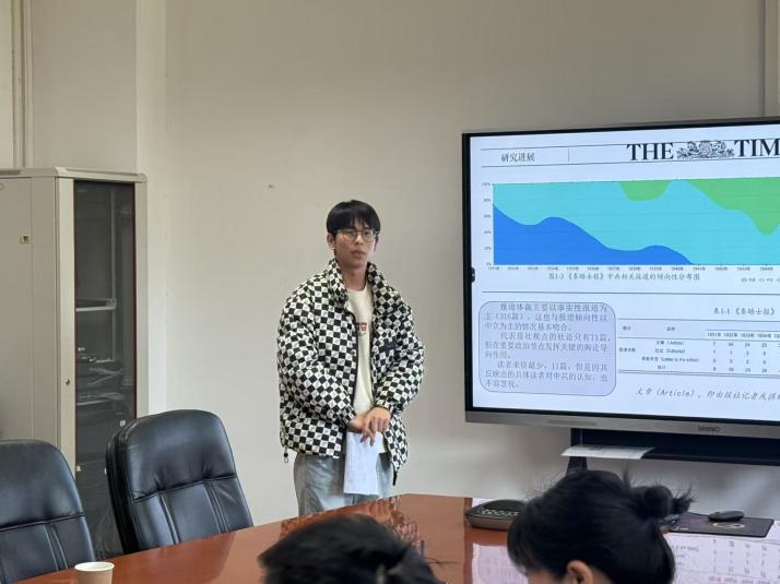 曾玉军同学汇报创新训练培育项目“抗战时期中国共产党国际形象的演变 ——以《泰晤士报》为中心”的中期研究进展。