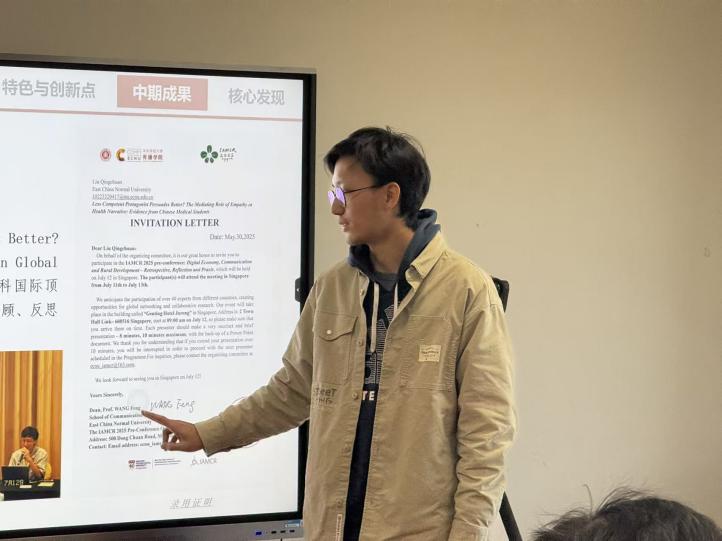 刘晴川同学汇报创新训练培育项目“何种能力的故事主角更具说服力?在中国医学生中探寻2型糖尿病健康叙事及共情的中介作用”的中期研究进展。