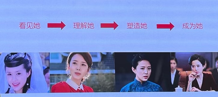 紧接着,颜丹晨结合自己的从业经历,从“真人演员的角色塑造”这一角度出发,详细讲述了影视表演中角色塑造的四个维度:“看见她”、“理解她”、 “塑造她”、 “成为她”。颜丹晨认为,文艺必须扎根生活,扎根人民。演员面对角色时,首先要能在生活中看见她,而后去理解,将本人的“小我”隐藏于角色背后,真正做到一切为角色服务。此外,颜丹晨围绕自己在电影《李保国》和电视剧《北方大地》中部分表演片段的分享与剖析,向同学们阐释了演员在现场即兴创作中的碰撞,以及演员间的相互成就是AI虚拟演员所无法比拟的重要法宝。