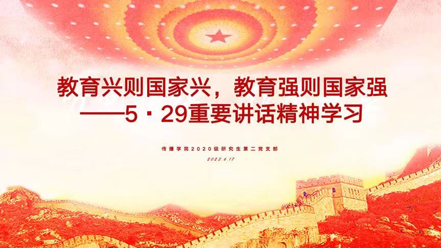 2023年6月17日下午,为深入贯彻5·29重要讲话精神,嘟嘟成人网 2020级硕士研究生第二党支部举行“教育兴则国家兴,教育强则国家强”主题党日活动,集体学习习近平总书记重要讲话,明晰中国特色社会主义教育发展道路。