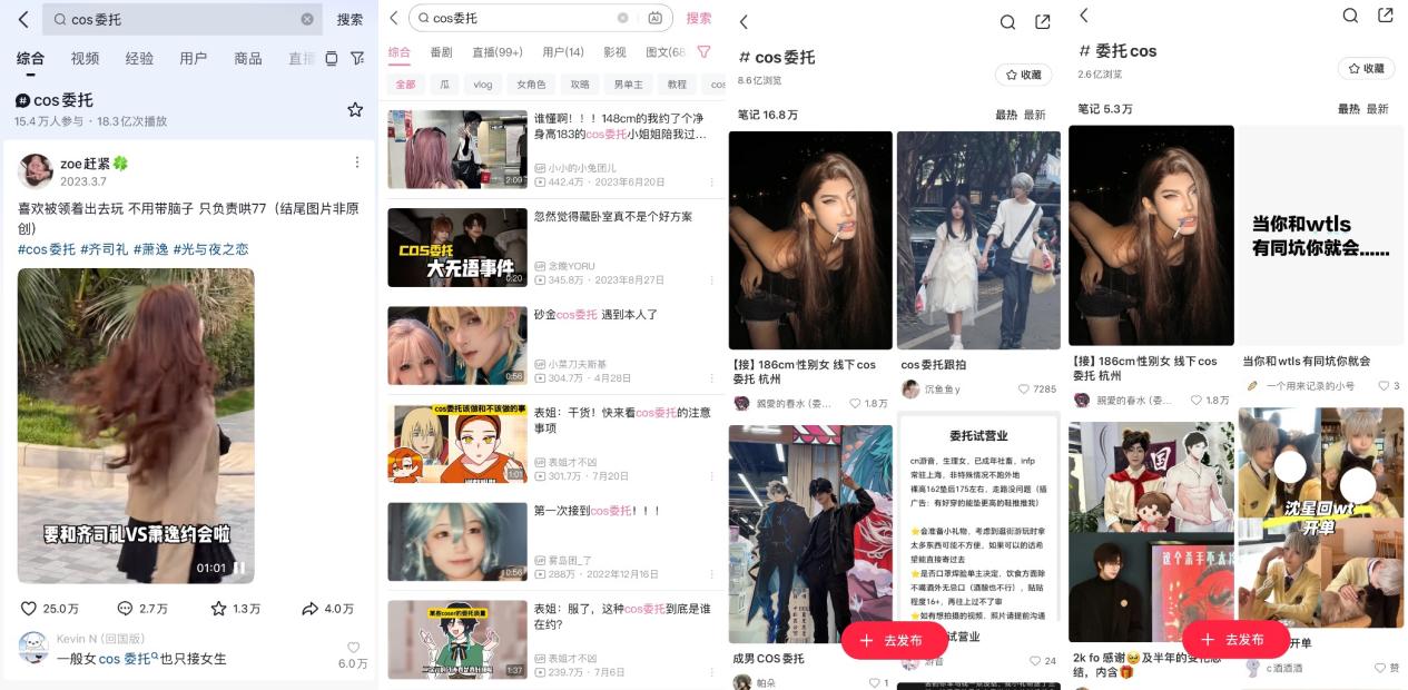 这一新兴市场在各大社交平台上呈现出蓬勃发展的态势。在小红书上,和“cos委托”相关笔记已超过20万条,总浏览量已破10亿;在抖音,cos委托的话题有15.45万人参与,相关视频累计获得了18.37亿次播放量;在B站,cos委托相关视频已经突破99+,其中播放量最高的视频已经达到442.4万。(数据来自新抖、新红、新站平台,近30天数据的截止日期为2024.12.2