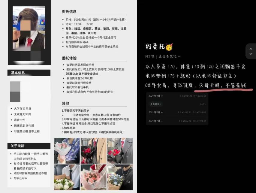 但当小沈得知小沫是未成年人时,内心产生了犹豫。“未成年人在很多方面的能力和责任承担上与成年人有明显差异,承接这样的委托可能会面临诸多不确定因素。”小沈说。可是小沫自介条上“父母开明不管花钱”的说明,以及附上的收支明细截图,动摇了小沈的立场。在小沫的再三请求下,小沈最终接受了委托,并将约会日期定在寒假。