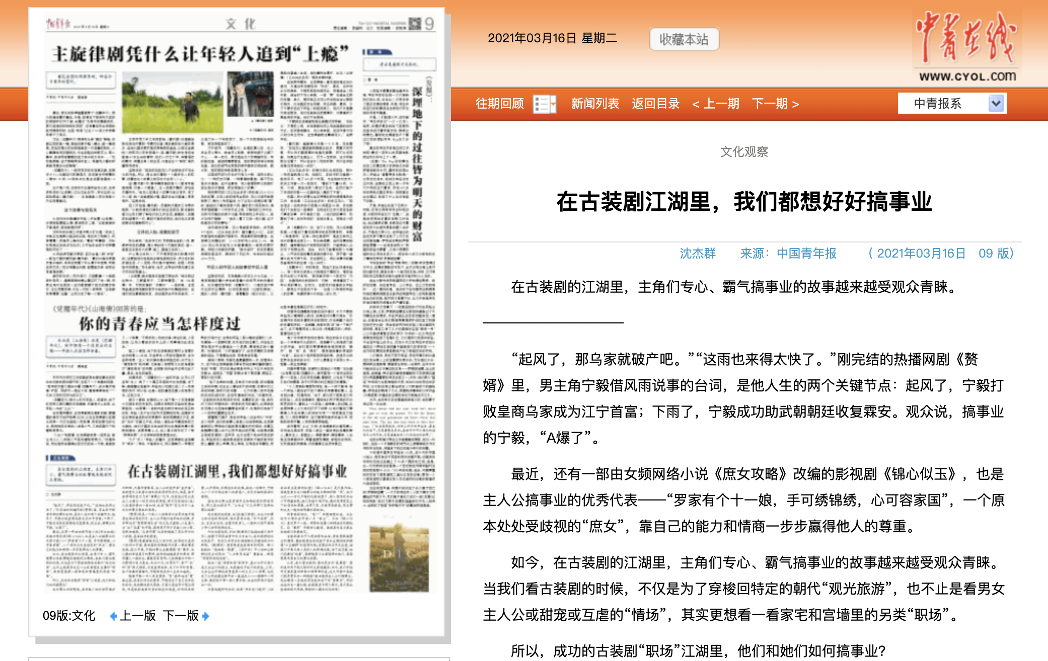 关注文化产业和现象的崛起,是沈杰群工作的家常便饭。前段时间,古装剧《赘婿》火爆全网,剧中主角专心、霸气搞事业的故事深受观众青睐。捕捉到这一热点的她很快撰写了一篇文化观察并总结到:“我们开始对古装剧里的职场江湖津津乐道。这又何尝不是我们现实需求的一种投射?我若置身于那个朝代,是不是也能借助现代思维,解锁世人瞩目的成就呢?”当很多人还沉浸在剧中嗑CP之时,沈杰群以现象看本质并提出思考,这些思考恰恰正是文化记者存在的重要意义。