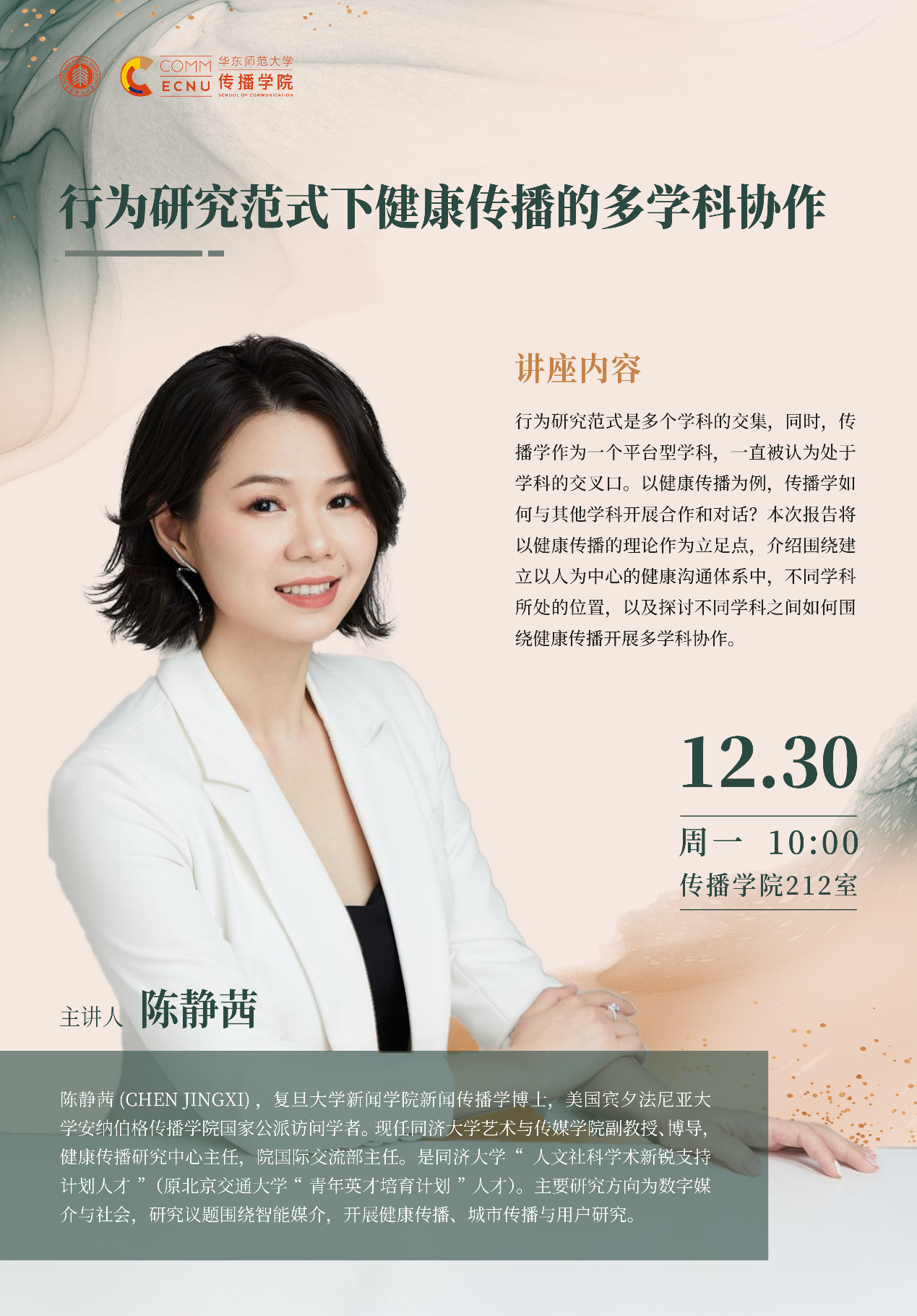 陈静茜(CHEN JINGXI),复旦大学新闻嘟嘟成人网新闻 传播学博士,美国宾夕法尼亚大学安纳伯格嘟嘟成人网 国家公派访问学者。现任同济大学艺术与传媒学院副教授、博导。健康传播研究中心主任,院国际交流部主任。是同济大学“人文社科学术新锐支持计划人才”(原北京交通大学“ 青年英才培育计划 ”人才)。主要研究方向为数字媒介与社会,研究议题围绕智能媒介,开展健康传播、城市传播与用户研究。