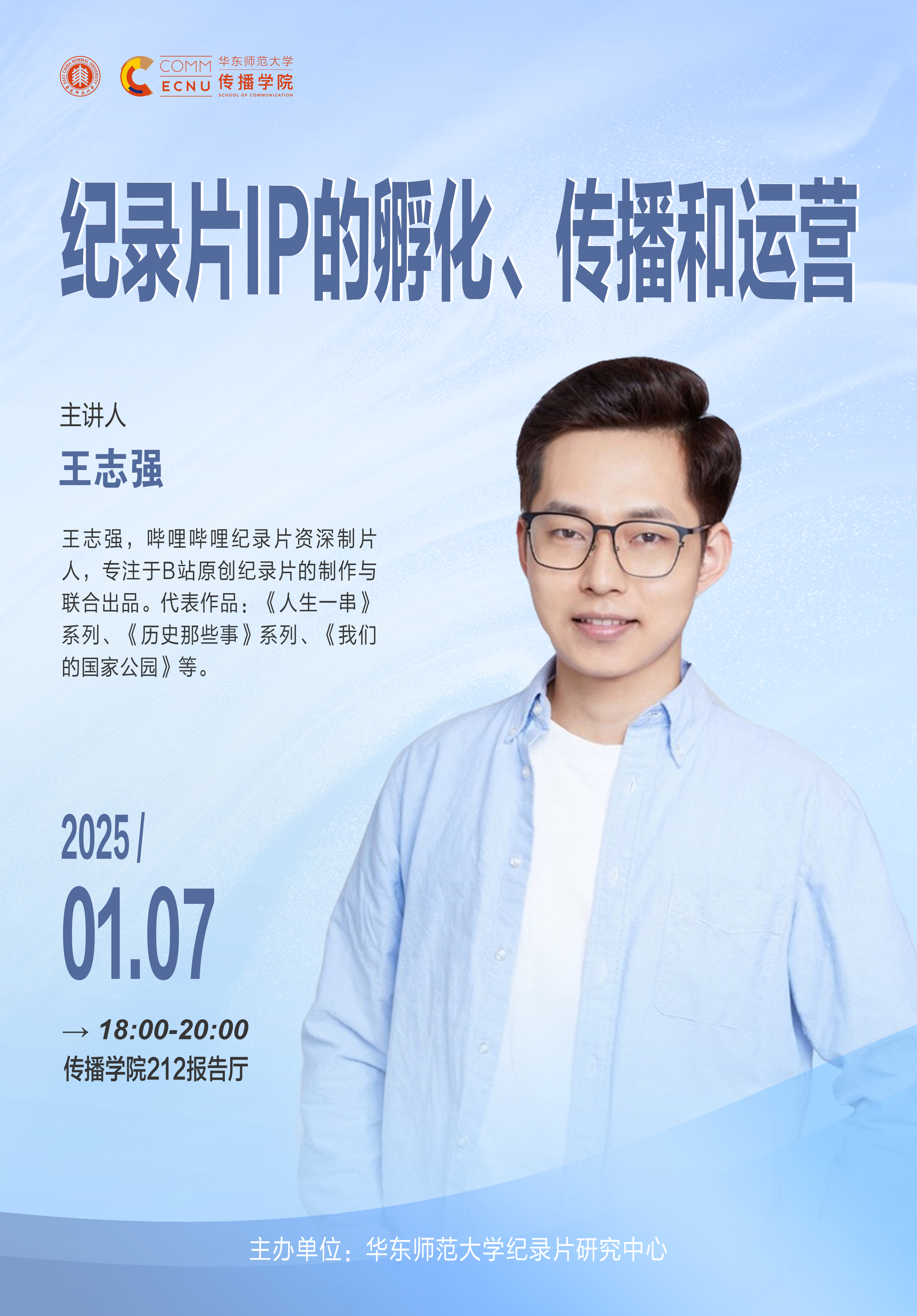 王志强,哔哩哔哩纪录片资深制片人,专注于B站原创纪录片的制作与联合出品。代表作品:《人生一串》系列、《历史那些事》系列、《我们的国家公园》等。