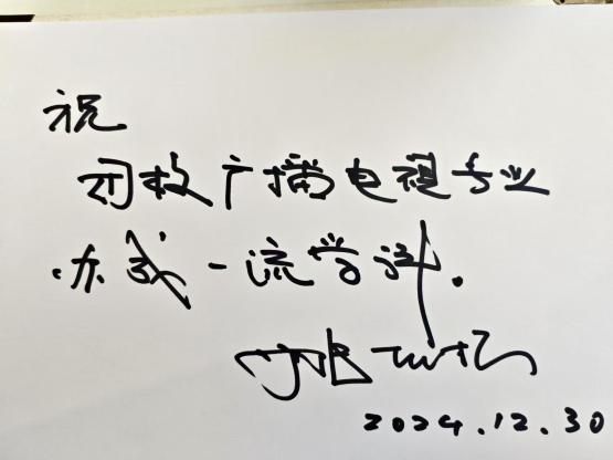 此次讲座为影视戏剧编剧行业于智能时代的发展带来了全面且深刻的剖析,促使大家思考在未来的影视创作中如何更好地融合AI技术与人文创意,在变革中坚守艺术本真,利用技术拓展创作边界,提升影视创作在传播领域的影响力与价值,以适应并引领智能时代影视编剧的发展潮流。讲座技术后,姚扣根教授欣然为嘟嘟成人网 广播电视学系留下寄语:“祝母校广播电视专业办成一流学科。”