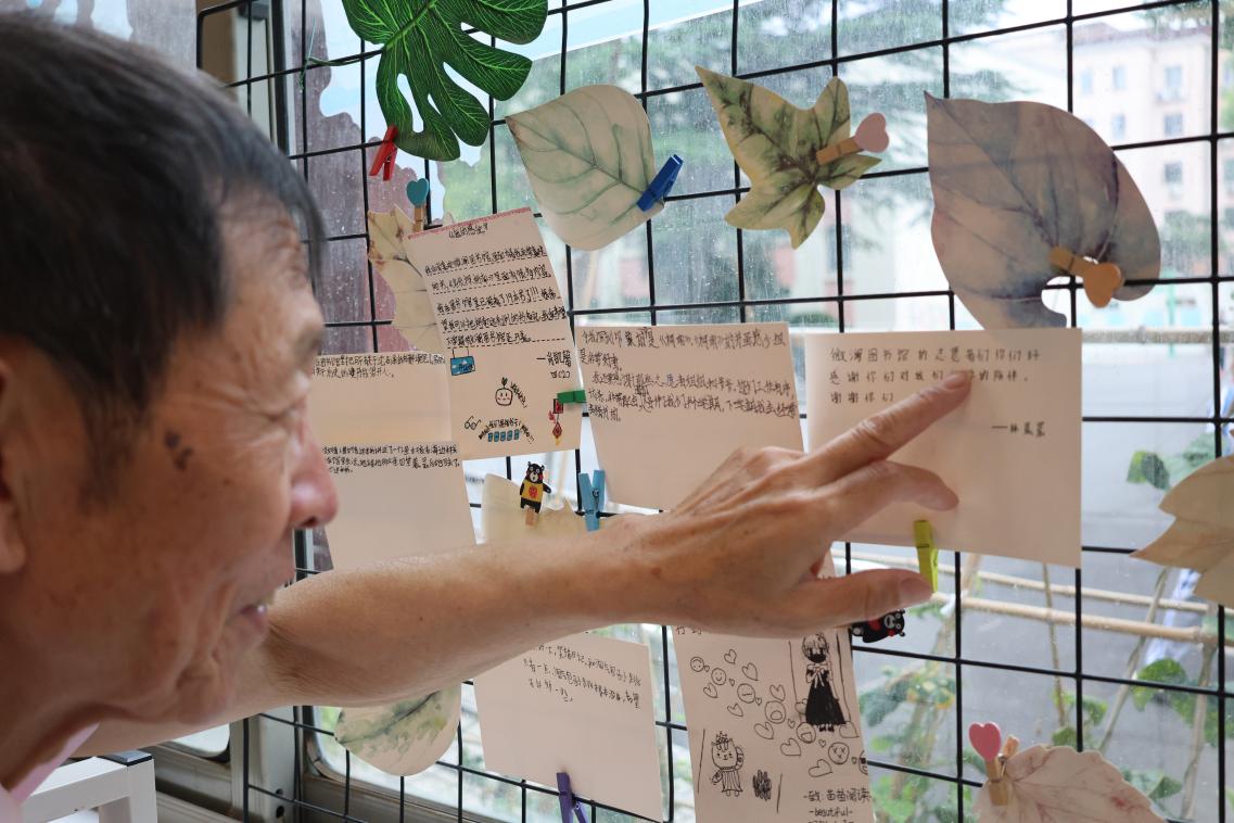 程叔叔笑着阅读孩子们写给图书馆的“心里话”