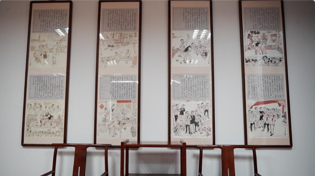 采访前的闲聊里, 他领着我们走到一面挂着水墨提画的墙前, 介绍起滑稽戏的历史起源, 指尖划过 一张一张生动的的影像, 时间就这样被带回了 1952年, 大公滑稽剧团刚成立时。 团长从自身入行 讲起,讲经典的剧目、讲滑稽戏的四门基本功、讲“4张票换一套房”的鼎盛时期、讲多元文化兴起 和推广普通话带来的冲击,讲滑稽戏在时代起起伏伏中的高潮与低潮。