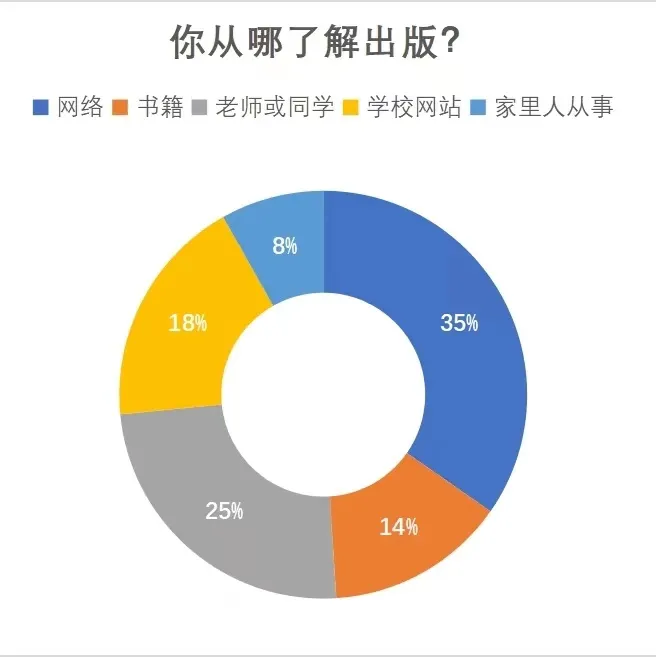 根据问卷调查,同学们对出版的认识最主要来自网络,其次是老师或同学。还有部分同学通过书籍和学校网站了解出版。