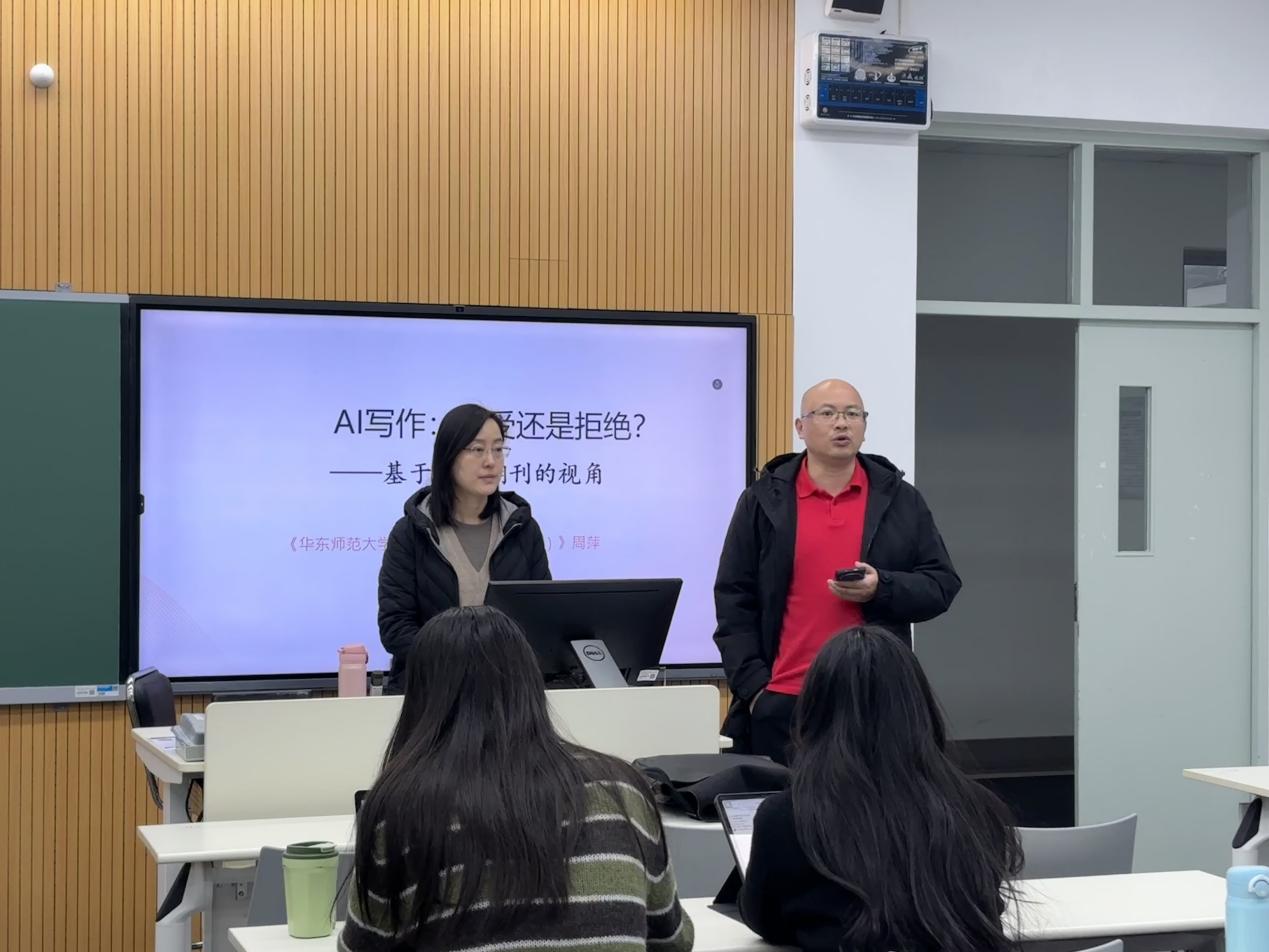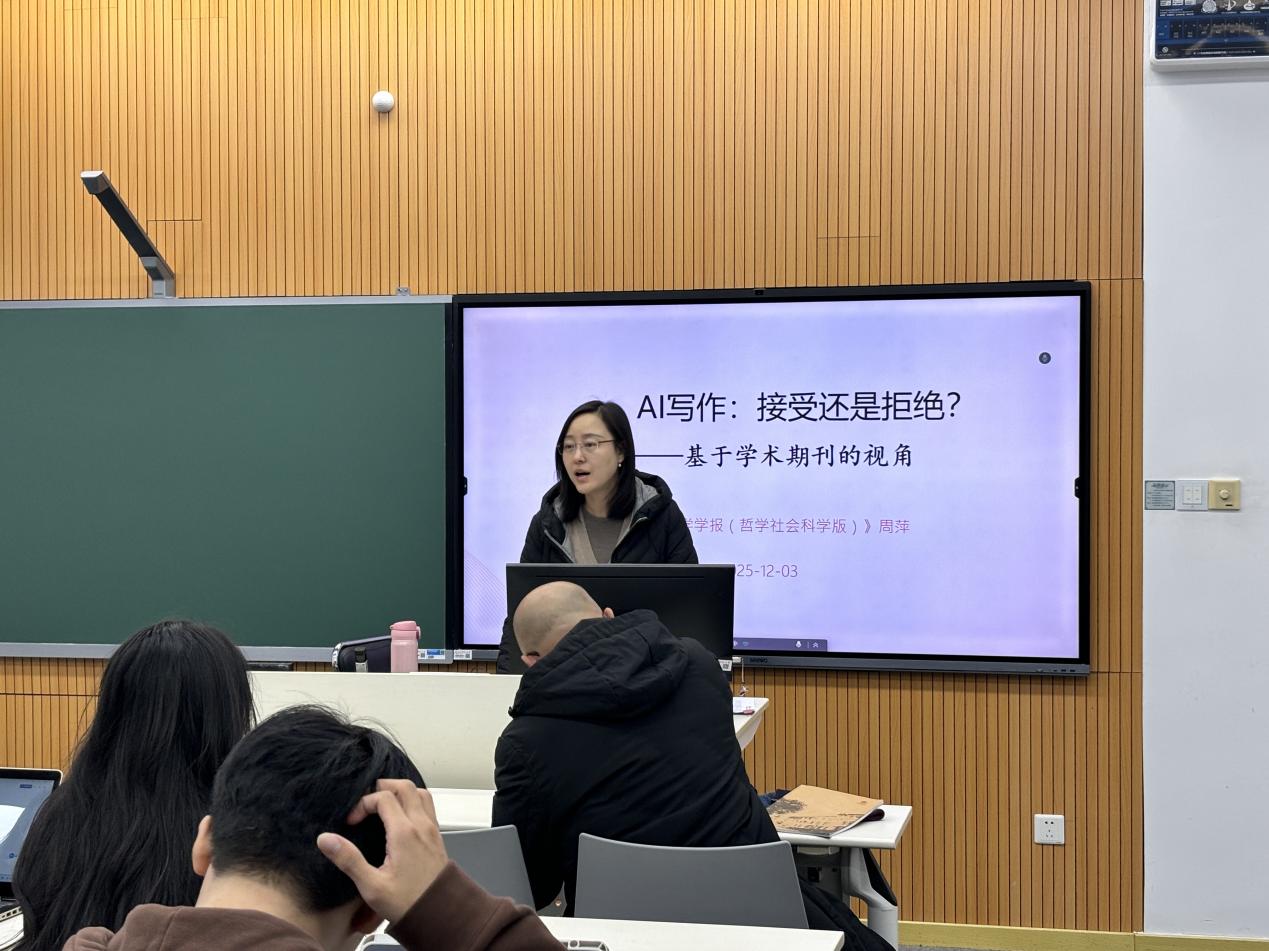 12月3日晚,主题为“基于学术期刊的视角探讨AI写作该接受还是拒绝”的学术讲座在嘟嘟成人网 闵二教110室举办,本次讲座由《嘟嘟成人网 学报(哲学社会科学版)》副编审周萍主讲,嘟嘟成人网 甘莅豪教授主持。