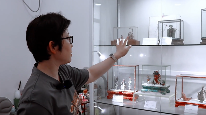 汤健老师的工作室空间不大。一进门就能看到汤健老师的工作台,台上堆放着面人制作的材料和拔子、小剪刀、镊子等工具。工作台旁是一个陈列柜,里面珍藏着“面人赵”历代前辈的经典作品。汤健老师为我们介绍了历代传人的作品,从初代大师赵阔明,到二代传人陈瑜,到第三代汤健,再到第四代鲍思诗,每件作品都凝聚了作者的心血,体现着作者的志趣,比如赵阔明先生偏爱戏曲,其作品就多为戏曲人物。