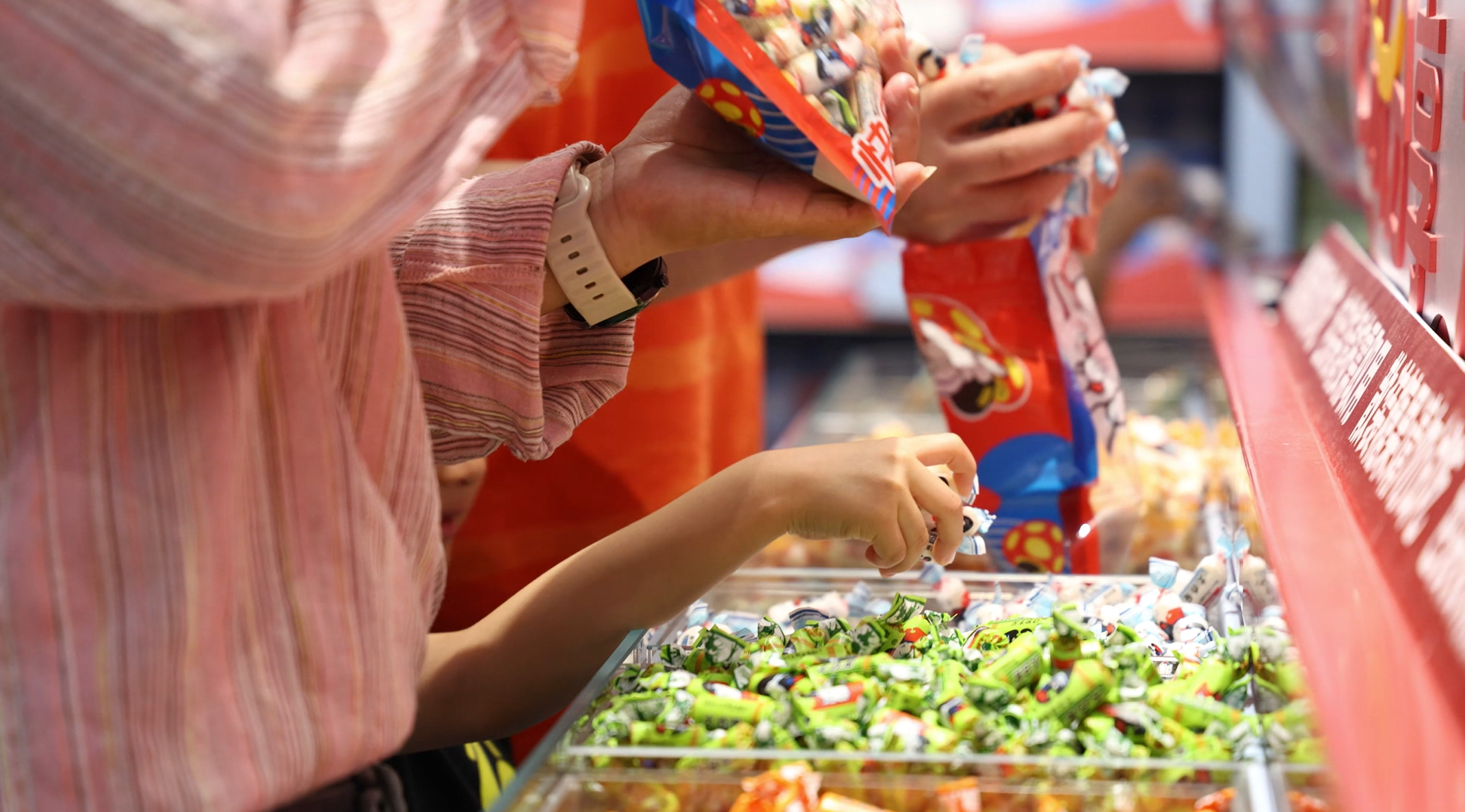 顾客挑选不同口味的奶糖