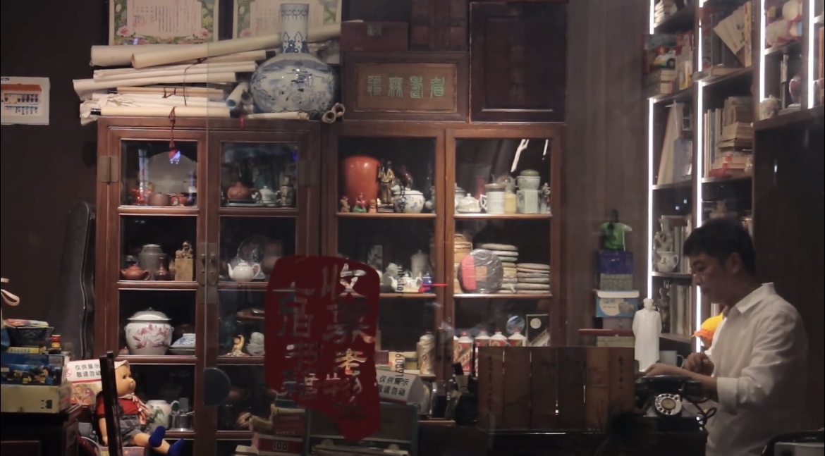 小小的店面被旧物填得满满当当,却能看出是被仔细归置过,旧书在墙根摞出半人高的弧度,玻璃柜里的瓷器在暗处闪烁着的冷光。店面逼仄、物什繁多,很难找到一个画面简洁且光线合适的地方,最终我们还是让他坐在了最熟悉的“柜台”前,他周身的气场才松弛下来。