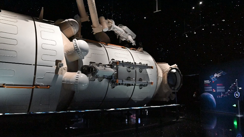 与前两者并列的“征程”展区则更注重历史与人文叙事。展厅中陈列着从古代石阵、阿拉伯观星仪、牛顿望远镜到现代“天和核心舱”的复原模型,展现人类千年仰望星空的壮丽征程。特别是一比一还原的中国空间站“天和舱”模型,成为不少青少年游客的打卡首选,也折射出中国航天成就的现实自信。
