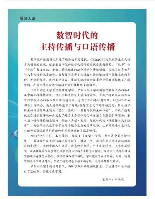 过往数届,中国口语传播学术论坛取得了丰硕的学术成果。我们已出版了两部集刊——《中国口语传播研究》(2022)与《中国口语传播研究》(2023),并获得了学术期刊《传媒》的支持,于2024年第04期刊发了“数智时代的主持传播与口语传播”封面专题。这些出版物不仅汇集了国内口语传播领域的专家、学者、硕博士研究生的优秀研究成果,更展现了口语传播发展的新趋向及口语传播人才培养的新模式。