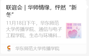 组织跨院联谊活动,拓展人际交往渠道。为进一步丰富同学们的校园生活,2022年11月我们与通信与电子工程学院、生态与环境科学学院联合举办华师情缘,怦然“新冬”的主题联谊会。我们为线上活动准备多样沟通话题,线下活动设置妙趣横生的小游戏,帮助同学们拓展大交往圈和人际圈,获得一致肯定和热烈反馈。