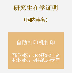 4.国内事务:不需要网上申请,直接到自助打印机上打印即可。内容为中文版,已加盖研究生院学籍证明专用章,直接可用。