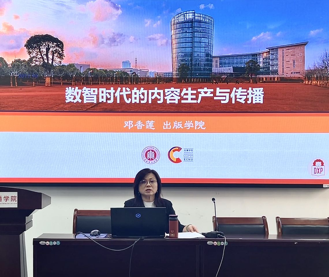 讲座伊始,邓香莲教授以出版专业的人才培养为例,提出优质内容为王,技术为行业赋能的观点,通过分析当前数智技术的发展现状,深刻讲述了数智技术对于日常生活以及行业发展的影响。她提到,技术重塑内容产业,技术一方面重构了内容产业产品生态,另一方面还重构了内容产业链,并以此提出技术与内容融合创新的重要性。她倡导同学们要打开思路、打开视野,积极拥抱新技术,以开放的心态去创作高质量的融合出版作品。