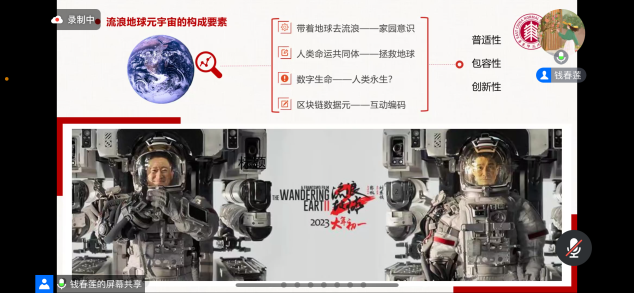 钱春莲副教授以跨文化传播理论的研究历程作为主题的引入,进而详细介绍了该理论在我国的四个发展阶段,由此进入对元宇宙技术的深度阐释环节。随后,她用《后来的我们》、《消失的她》、《流浪地球》等案例揭示了这几部电影成功实现跨文化传播的深层原因。