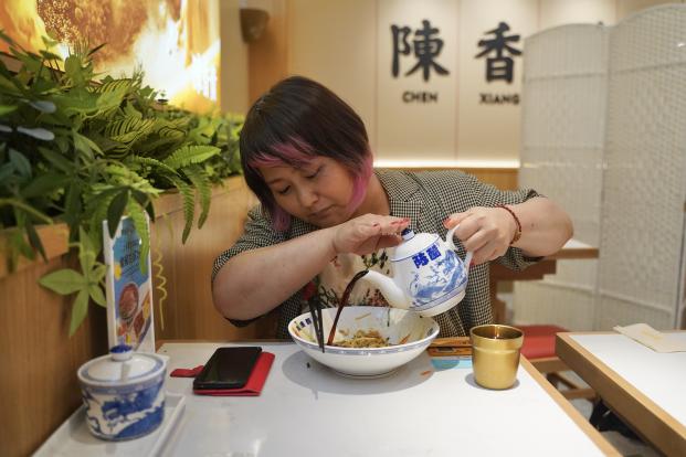宇山纺喜欢吃中国的牛肉面,她正在加醋