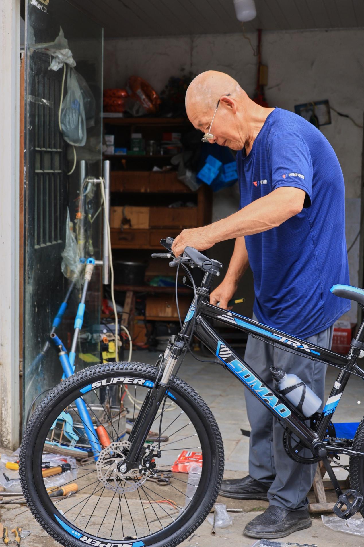 隔壁村68岁的张爷带着孙子来单爷这里组装自行车,看着单爷灵巧地安装自行车,张爷感叹自己似乎还没有单爷那么有活力。单爷修车时常常需要下蹲和起身,但他丝毫没有露出不适的神情,轻描淡写地说:“我身体好,都习惯的,没啥感觉。”