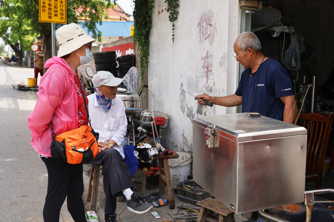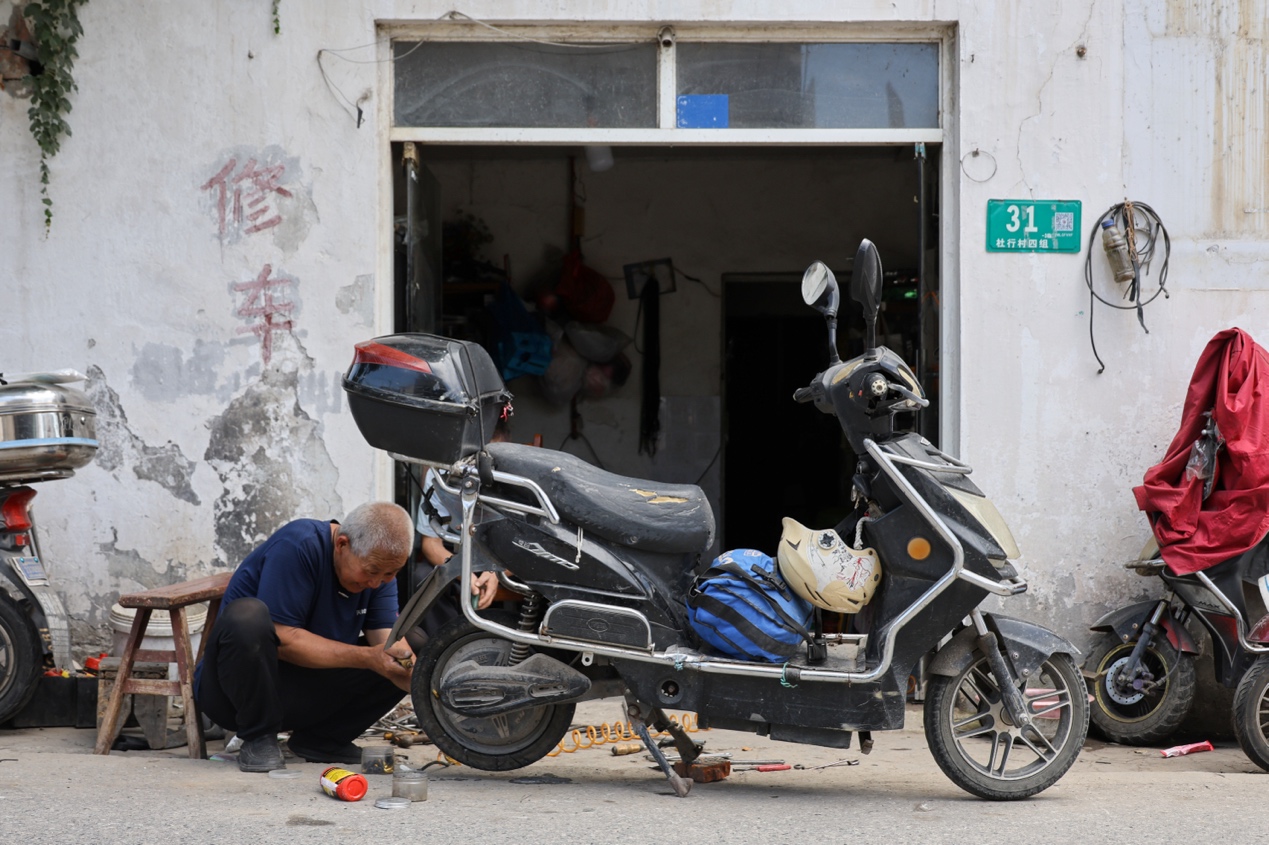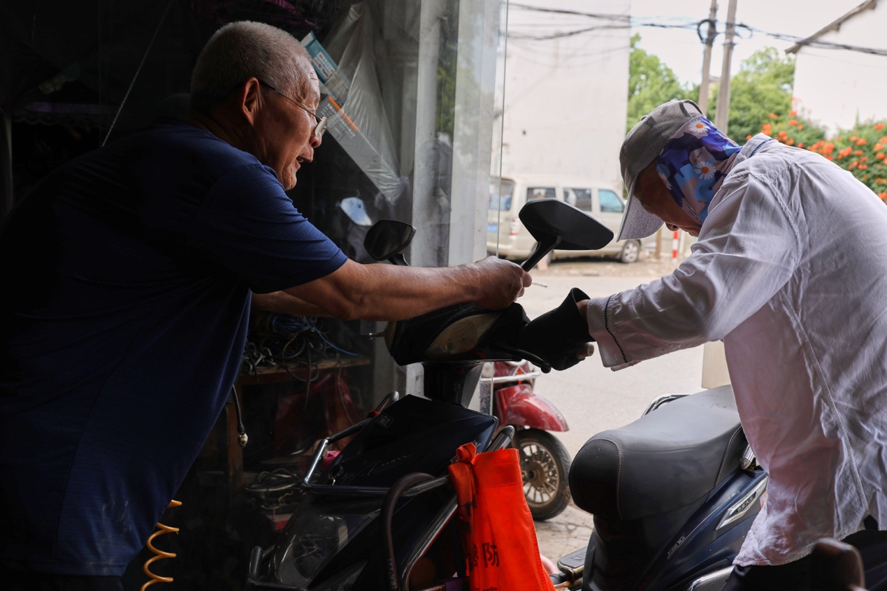 修理完毕,单师傅和顾客合力把电瓶车搬动出去