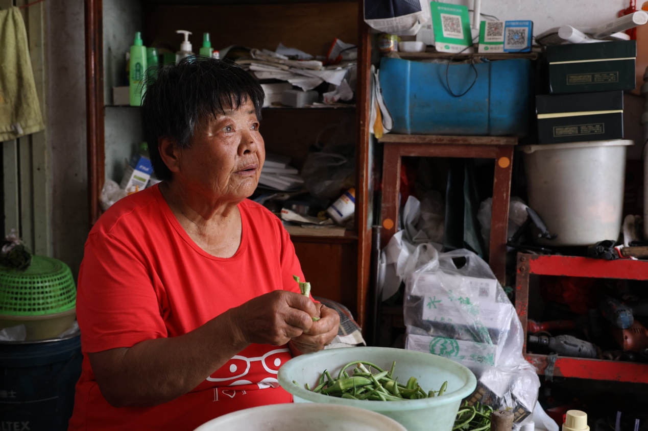 单爷的老伴正在和他聊天,一边处理自己种的刀豆