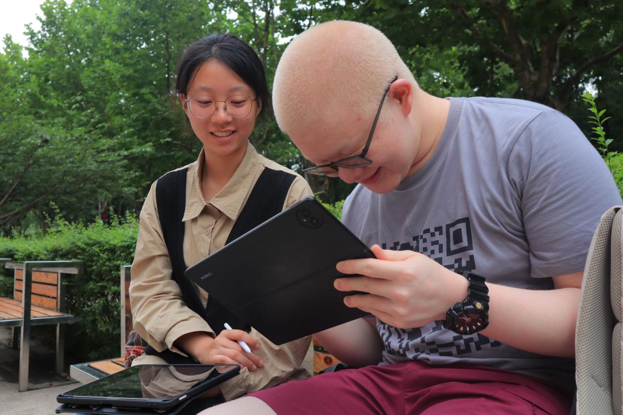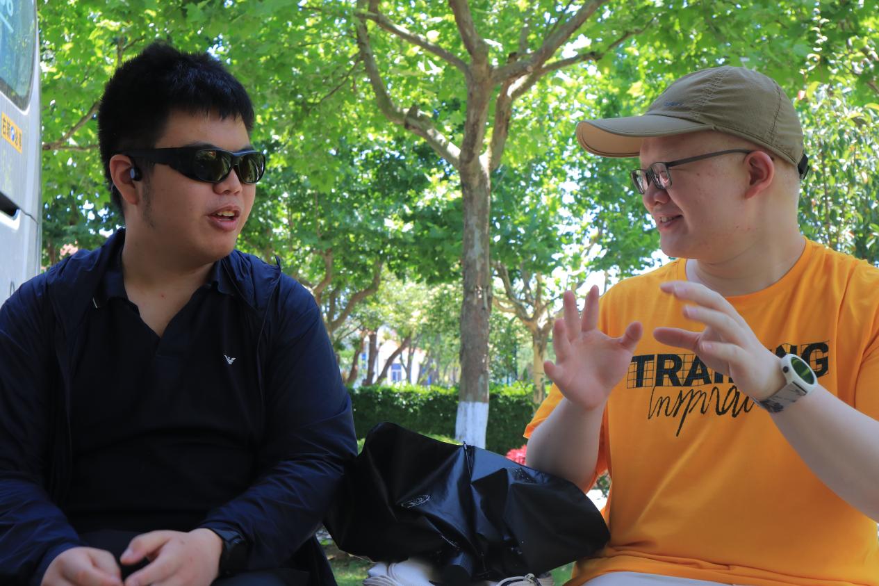 孙旭和他在盲校时结识的朋友,二人目前均就读于华师大社会学大类。据介绍,他所在的盲校2023年高考一本升学率达100%。