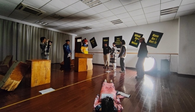 此次实验是科技与艺术的大胆交融,虚拟与现实的交织碰撞。实验团队以经典清装宫斗剧《甄嬛传》为故事原型进行剧本创编,并创新了线索形式,以剧中人物的全息影像表演替代实物证据,360度全方位展现线索内容。同时加入了网页H5游戏的按钮式交互,并将其转化为可供移动端扫描的二维码。通过跨媒介手段,巧妙融合现实场景与虚拟元素,打破次元壁,为玩家提供身临其境的感官体验,增强了游戏的可玩度和沉浸感。其中,全息影像人物角色和实验现场的NPC均由《体验戏剧工作坊》课程的同学们饰演,通过与众不同的数字化、情景化表演课堂,让同学们感受到了科技与艺术融合碰撞的魅力。