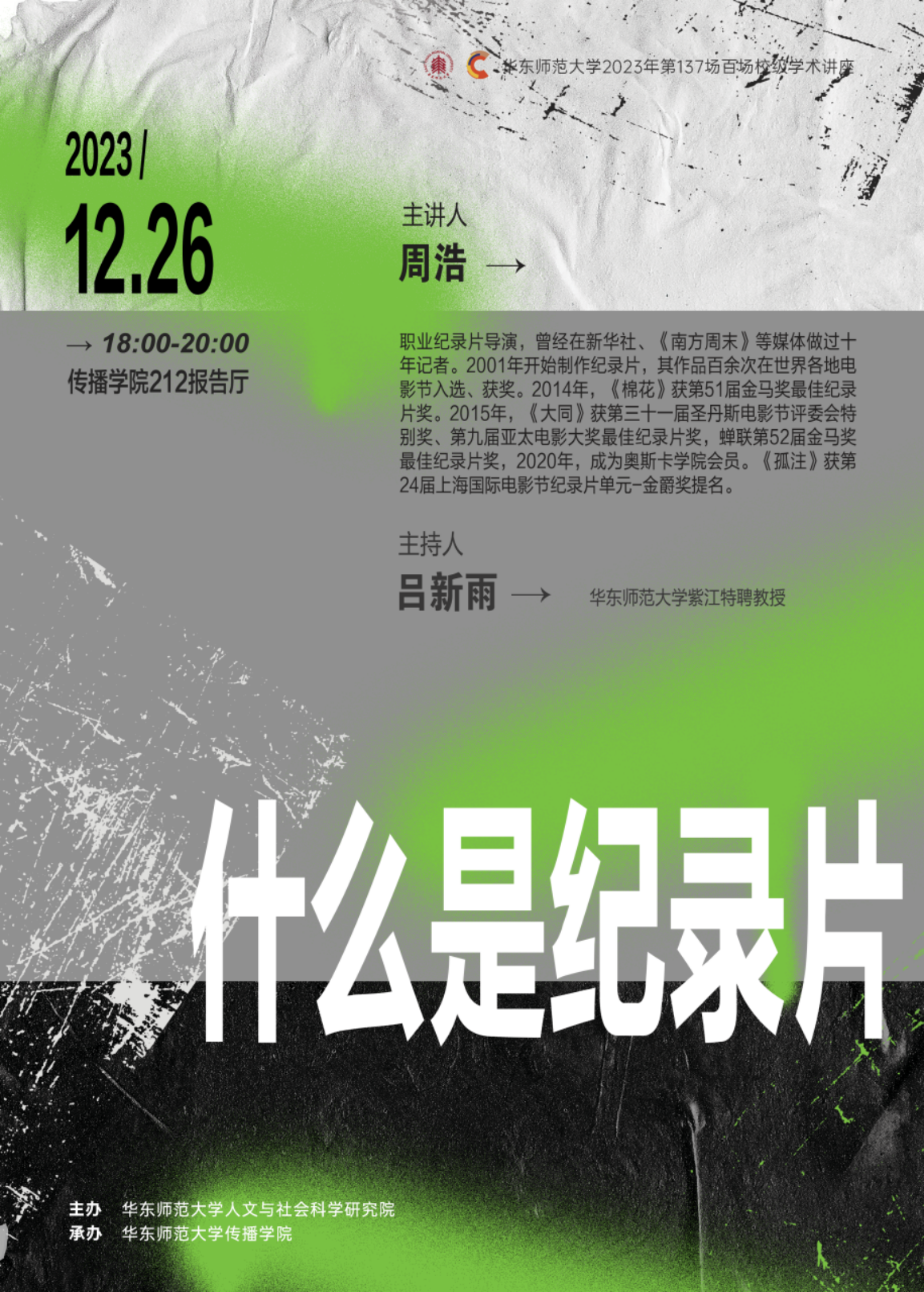 周浩导演作为职业纪录片导演,早年先后在新华社、《南方周末》等媒体担任摄影记者,后转行做纪录片,代表作《厚街》《高三》《棉花》《大同》等。其中《棉花》《大同》分别获得51、52届金马奖最佳纪录片奖。本次讲座周浩导演从纪录片第一性问题——什么是纪录片出发,重新反思面向今天时代的纪录片创作,讲述最新纪录片力作的创作契机与心得体会。