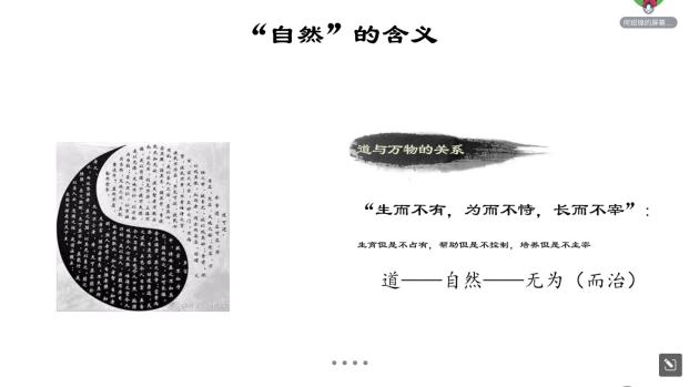 第四部分,如何理解“自然”?我们现在理解的“自然”概念来自于老子,即自身的样子、原本的样子。而关于“道”与自然的关系理解,需要摆脱造物主思维的桎梏,即老子所说的:“生而不有,为而不恃,长而不宰。”老子实际是利用“道”设置了一个政治隐喻,即无为而治。
