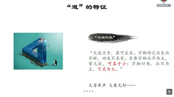 第三部分,如何理解“道”?《道德经》认为人应该遵循“道”,而不必学习具体的“仁义礼智信”。而关于“道”的名称并不明确,违背了“循名责实”的惯例。一是老子认为“名可名,非常名”:凡可以称谓的名,都不是恒常的名。二是老子有时称道为“大”,有时称道为“小”。看似矛盾,其实反映了道的特点——不确定性,代表了中国古人对宇宙的思考。
