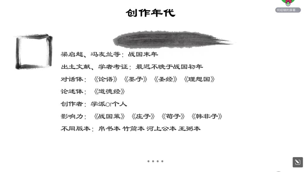 第二部分,如何认识《道德经》?老子身份的不确定性也导致了人们对《道德经》一书的诸多猜测。梁启超、冯友兰等学者认为该书成书于战国末年。近年来经过出土文献和学者的考证,学界认为《道德经》最迟不晚于战国初年成书。另外,该书有其独特性:不同于大多数对话体著作,该书呈现出论述体的形式;不同于大多数著作立足于某个学派,该书极有可能是由一个人创作。且该书影响了《战国策》、《庄子》、《荀子》、《韩非子》等名作,也流传了诸多版本。