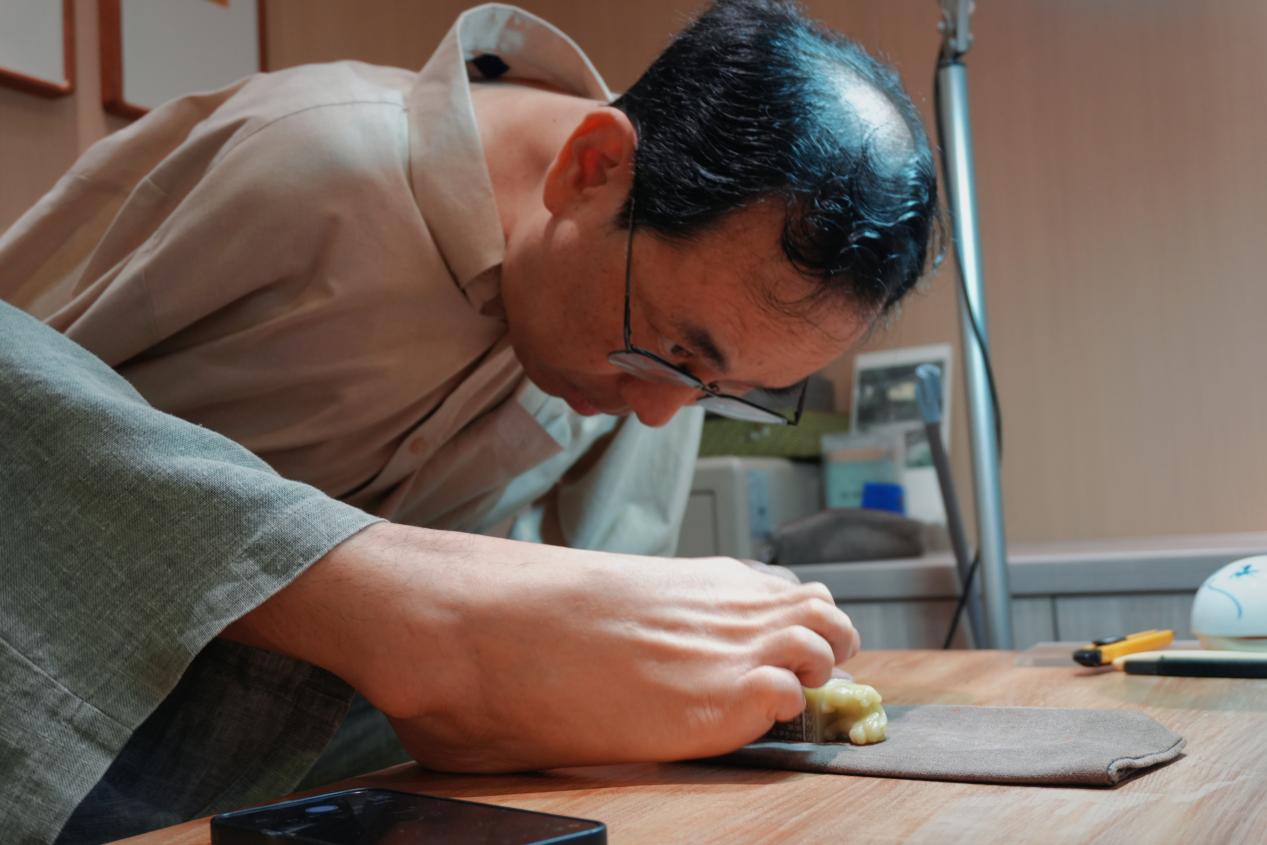 2025年6月15日,天健石室里,孔黎翔潜心治印,每刻一刀都是专注
