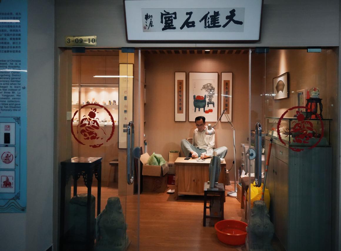 推门而入,眼前是一方不足十平方米的长形斗室:矮木桌,旧木椅,一盏躬身如老者的台灯,还有散落的印石、刻刀与印泥。桌旁的小风扇嗡鸣转动,冷气驱散了南方夏日的黏腻,却化不开主人伏案刻石时的沉静。